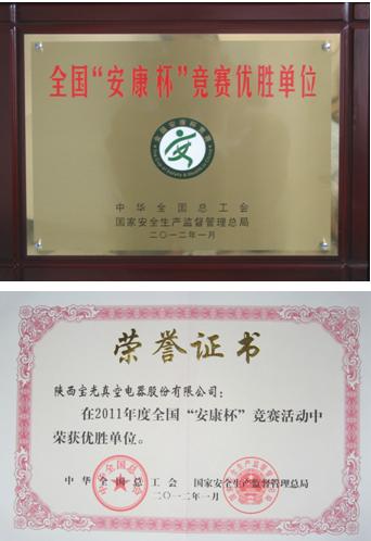 我公司榮獲2011年度全國“安康杯”競賽優(yōu)勝單位稱號。全國“安康杯”競賽活動是全國總工會、國家安全生產(chǎn)監(jiān)督管理總局聯(lián)合開展的全國工業(yè)企業(yè)安全生產(chǎn)與職業(yè)衛(wèi)生健康活動。自1999年開展以來,我公司已于2001年、2007年、2011年三次榮獲全國“安康杯”競賽活動優(yōu)勝單位殊榮。