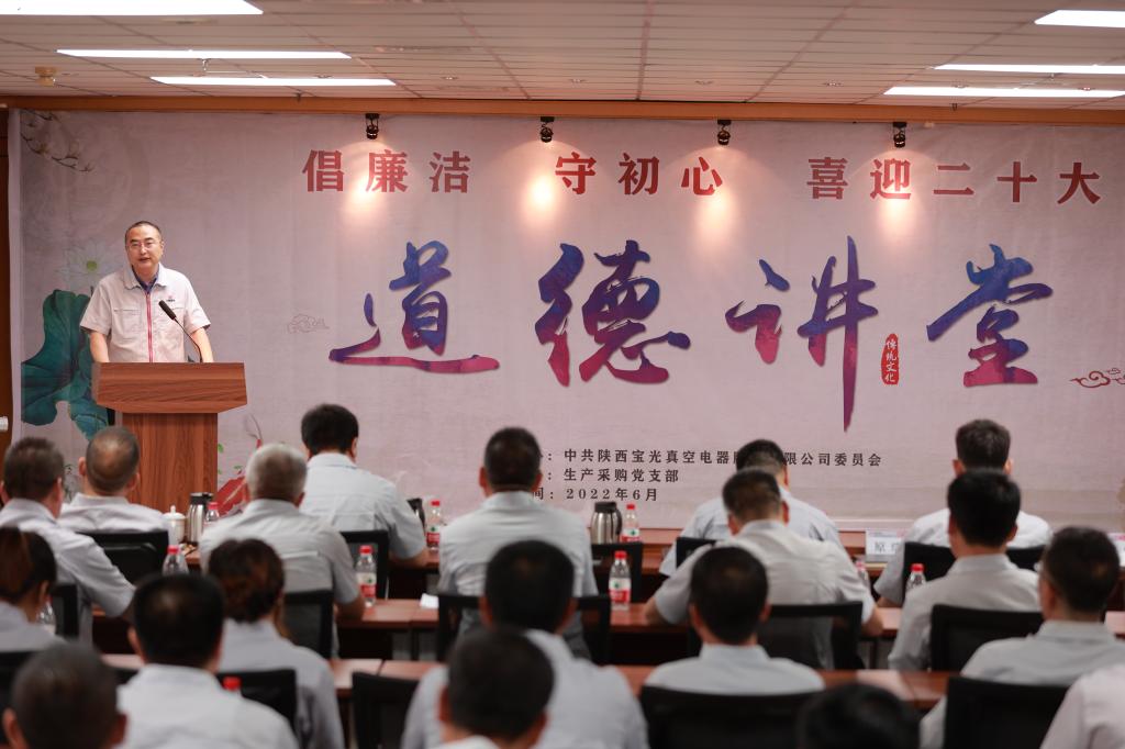 為將黨史學習教育不斷引向深入,全面提升廣大職工道德素養,進一步促進企業精神文明建設,切實激發廣大干部職工砥礪奮進、爭開新局的信心和決心,以更加飽滿的工作熱情迎接建黨101周年和黨的二十大的勝利召開,6月28日下午,由寶光股份黨委主辦,生產采購黨支部承辦的“倡廉潔、守初心、喜迎二十大”主題道德講堂如期舉行。