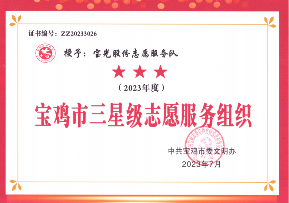 日前,寶光股份志愿服務(wù)隊(duì)被中共寶雞市委文明辦評為“寶雞市三星級志愿服務(wù)組織”。