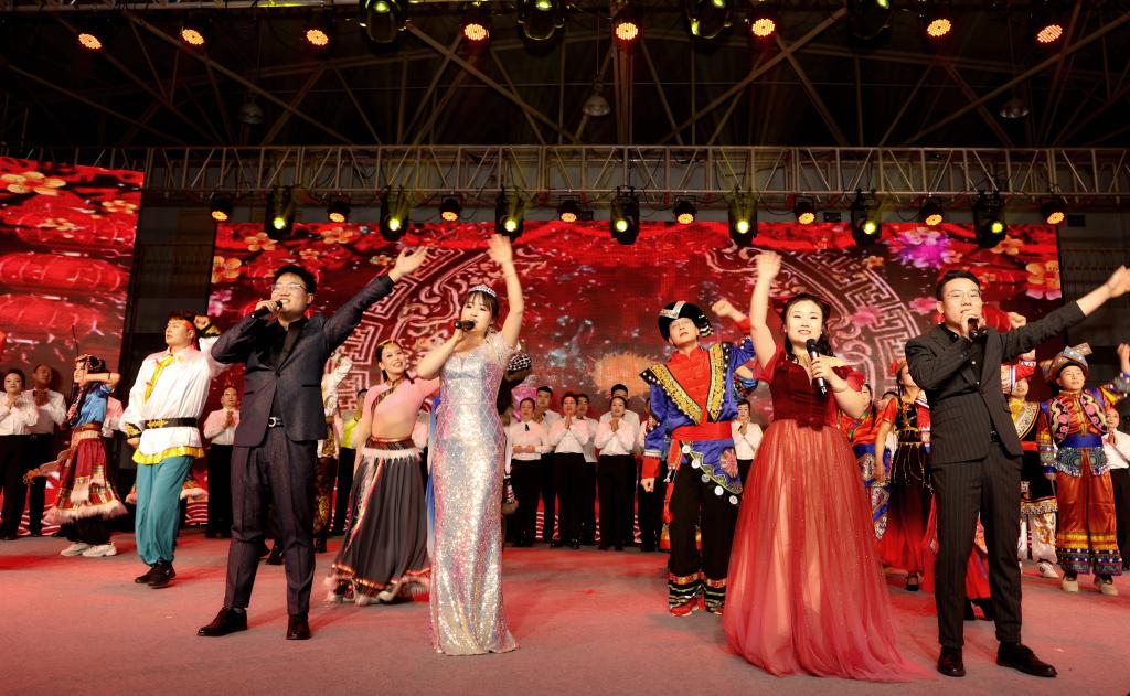 演出結束后,公司領導走上舞臺,與演出人員合影留念,同慶龍年新春。