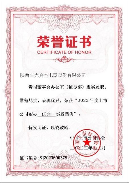 自寶光股份上市以來,董事會(huì)與管理層高度重視各項(xiàng)工作,董辦團(tuán)隊(duì)切實(shí)關(guān)注各項(xiàng)履職能力提升,堅(jiān)守初心,嚴(yán)格按照法律法規(guī)開展各項(xiàng)工作。獲得此項(xiàng)榮譽(yù)充分體現(xiàn)了中國上市公司協(xié)會(huì)對(duì)寶光股份董事會(huì)辦公室信息披露管理、治理機(jī)制建設(shè)、投資者關(guān)系管理、相關(guān)制度制定修訂、ESG管理披露、監(jiān)督培訓(xùn)等各項(xiàng)工作成果的高度認(rèn)可和充分肯定。